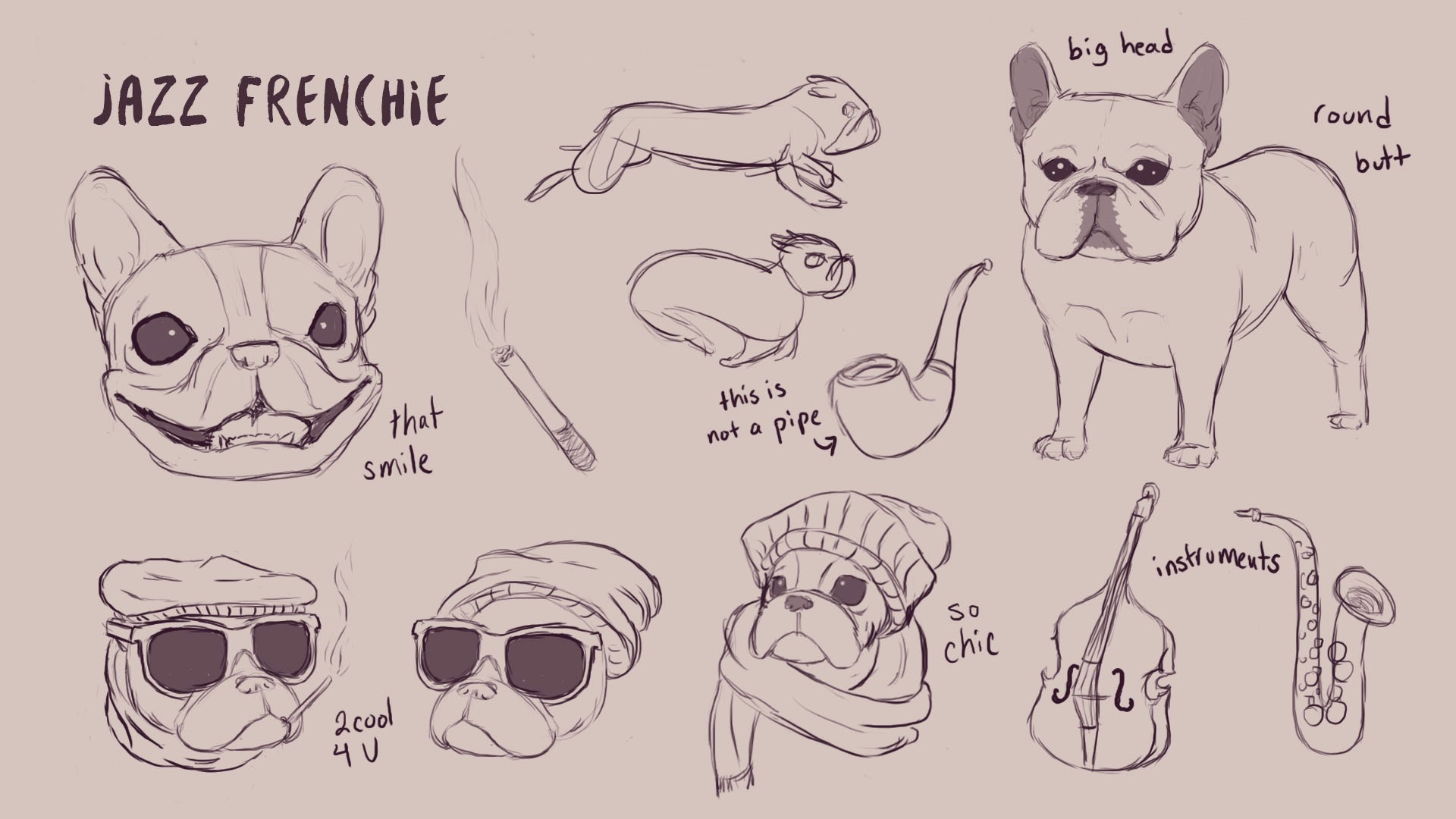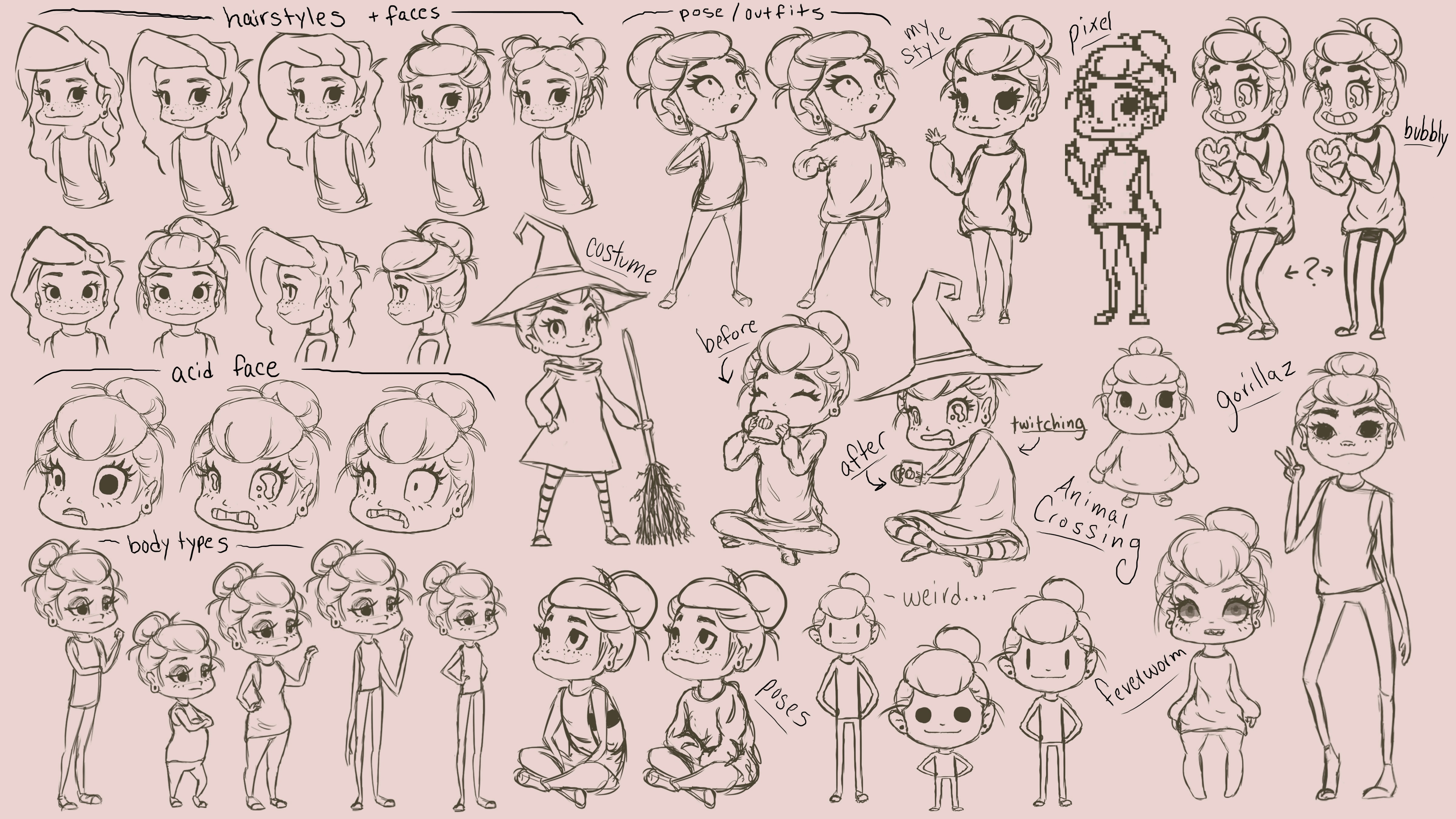 Here's a little peak into my thought process when I'm designing characters. These first two were from when I was trying to draw myself for a short film and was figuring out the right style. The next few were from a random prompt challenge where I was mashing up two words to make a fun new character.