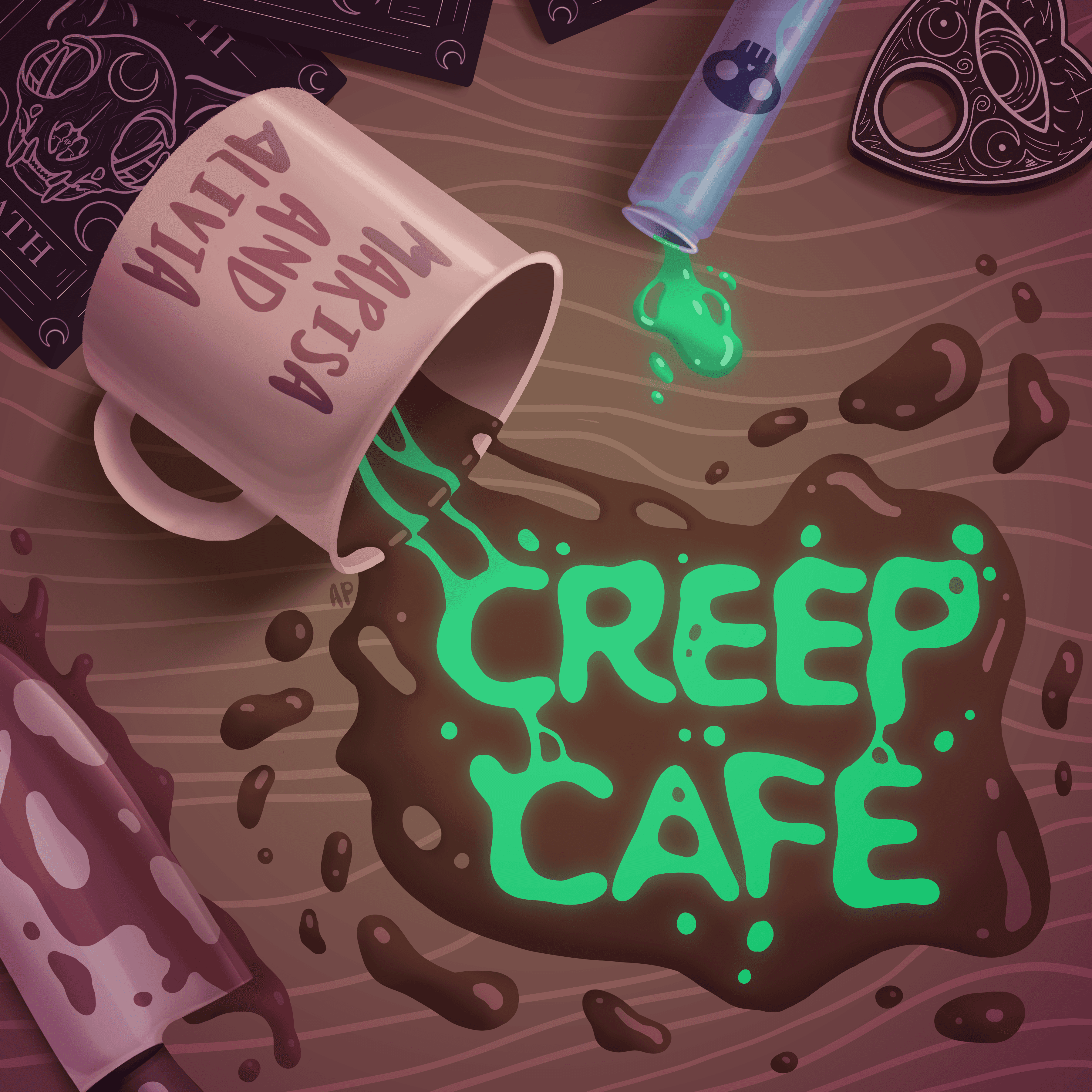My friends started a true crime podcast on Spotify during the pandemic, and they asked me to make a logo for them. Of course, I was thrilled to do so! Just two girls yapping into the void over cups of coffee, telling spooky stories, spilling all the tea.
