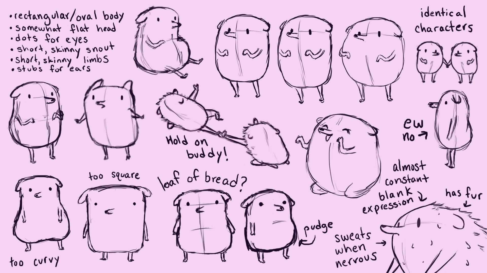 One of my favorite parts of the animation process is the character design. These were inspired by the flour sack exercises I'm sure most animators are very familiar with. Much like loaves of bread, they're just little rounded rectangle guys with tiny limbs and little snoots. I wanted them to have really dumb, blank expressions, but the emotions would come through with their body language and subtle facial movements.